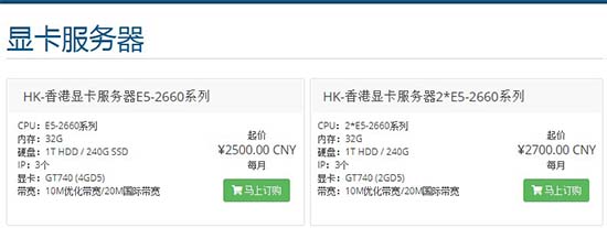 站長朋友一般都聽說過云服務器、物理服務器、高防服務器,大帶寬服務器,有沒有聽說過顯卡服務器?對于我們一般的用戶而言,選擇虛擬主機、云服務器和VPS主機是比較常見的,但是對于顯卡服務器應該使用的不多。在體驗Megalayer服務商的時候,有看到居然有提供兩款香港服務器的顯卡服務器。如下圖所示: