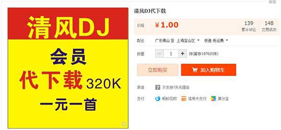 除了清風(fēng)dj音樂官網(wǎng)下載之外,我們還可以找萬能的淘寶找人代下載。當(dāng)然這也是收費的,并非免費下載清風(fēng)dj音樂。不過,淘寶下載價格比較優(yōu)惠、只需要1元/首,購買靈活、風(fēng)險低,如下圖所示: