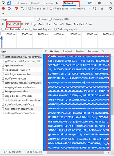 2、這款下載器的原理是需要調(diào)用cookie,cookie在不同瀏覽器不同賬號(hào)下都不一樣,所以初次使用,需要完成cookie操作。打開百度文庫(kù)官網(wǎng),登錄自己的賬號(hào),按下F12調(diào)出瀏覽器控制臺(tái),選擇network,然后再選擇Fetch/XHR,后「刷新網(wǎng)頁(yè)」,點(diǎn)擊左邊框Name,然后找到cookie內(nèi)容右擊鼠標(biāo)復(fù)制下來(lái)。(cookie有多個(gè),可能有所不同)