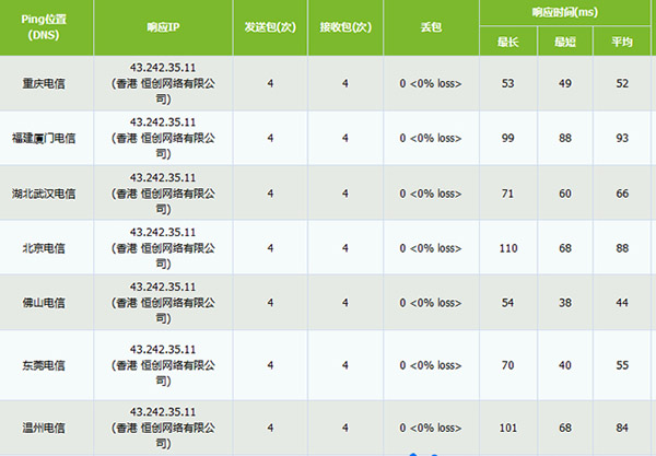 關(guān)于這個(gè)問(wèn)題,由于本站使用的是【 騰訊云 】服務(wù)器,暫時(shí)沒(méi)有使用恒創(chuàng)科技香港服務(wù)器。對(duì)于恒創(chuàng)科技香港服務(wù)器的速度、以及穩(wěn)定性,無(wú)法給大家實(shí)質(zhì)性建議。下面的PING速度測(cè)試圖,是來(lái)自老左博客關(guān)于恒創(chuàng)科技香港服務(wù)器的測(cè)評(píng),大家可以參考下: